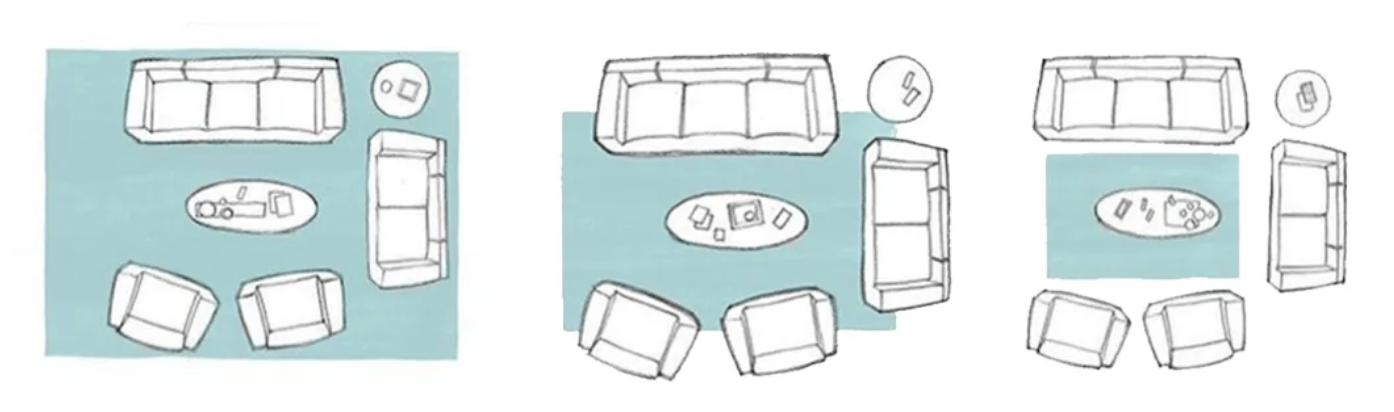 Với những căn phòng khách có diện tích vừa và nhỏ, ghế sofa thường được đặt dựa vào tường, theo cách bố trí này thì bàn trà sẽ là trung tâm của căn phòng. Bạn nên chọn một tấm thảm với kích thước vừa phải đặt bên dưới bàn trà, đồng thời đảm bảo kê hai chân trước của ghế sofa, ghế đơn và các món đồ nội thất khác trên mặt thảm.