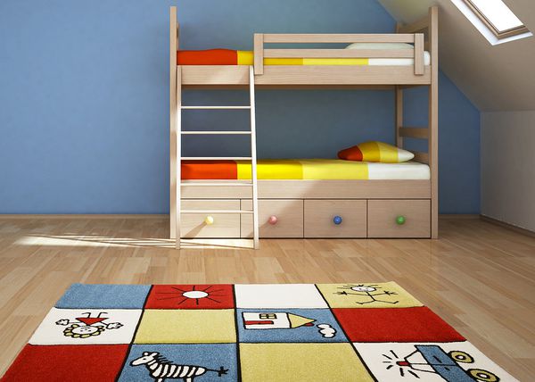 Thảm trải sàn phòng bé với các hình vuông đan xen kết hợp gam màu sắc đa dạng cùng các hình thù sống động tăng điểm nhấn cho căn phòng.
